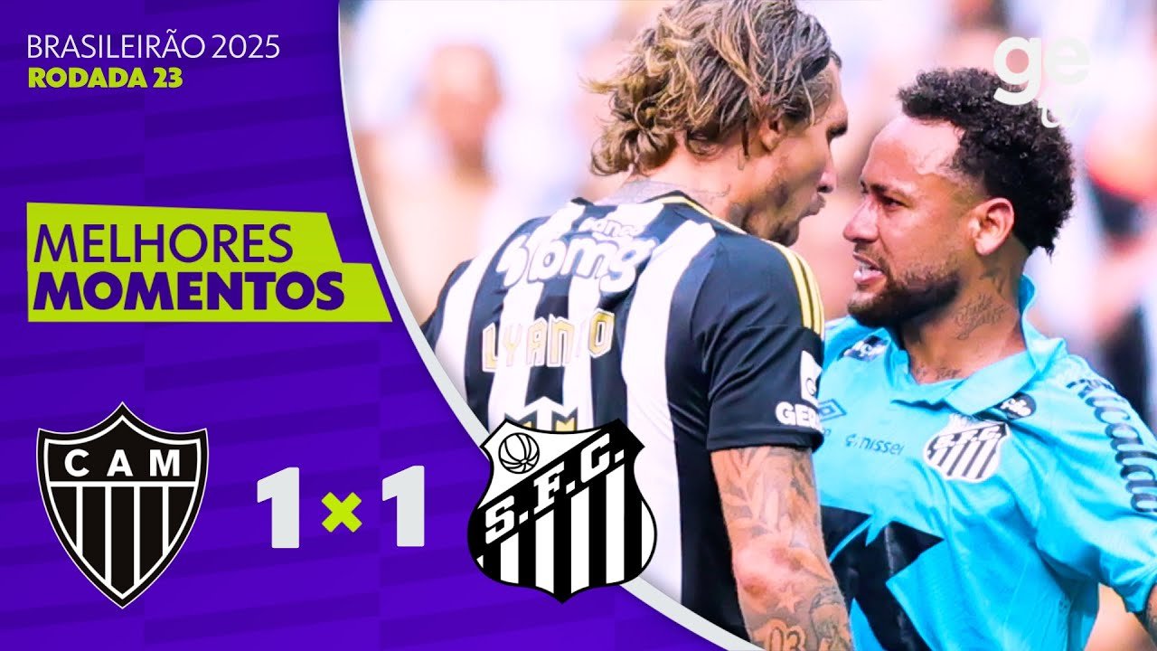 Teve de tudo neste domingo na Arena MRV. Hulk e Neymar em campo, grandes defesas, lance polêmico, ambulância, cartão vermelho e, claro, gols. Com esses ingredientes, Atlético-MG e Santos ficaram no 1 a 1, na partida pela 23ª rodada do Campeonato Brasileiro. O time paulista dominou a primeira metade do jogo, mas não conseguiu transformar a superioridade em gol. Aos 32 minutos, Neymar furou ao tentar finalizar de frente para a meta do goleiro Everson. No segundo tempo, o Peixe teve o zagueiro Zé Ivaldo expulso aos nove minutos. Pouco depois, Igor Gomes lançou o lançamento de Scarpa e abriu o cartaz para os donos da casa. Aos 40 minutos, Tiquinho Soares, cobrando pênalti, deixou tudo igual. Com o placar de 1 a 1, os dois horários ampliam o jejum na temporada. Vaiado no fim da partida, o Atlético chega a cinco jogos seguidos sem vencer, enquanto o Santos completa quatro partidas sem vitória.