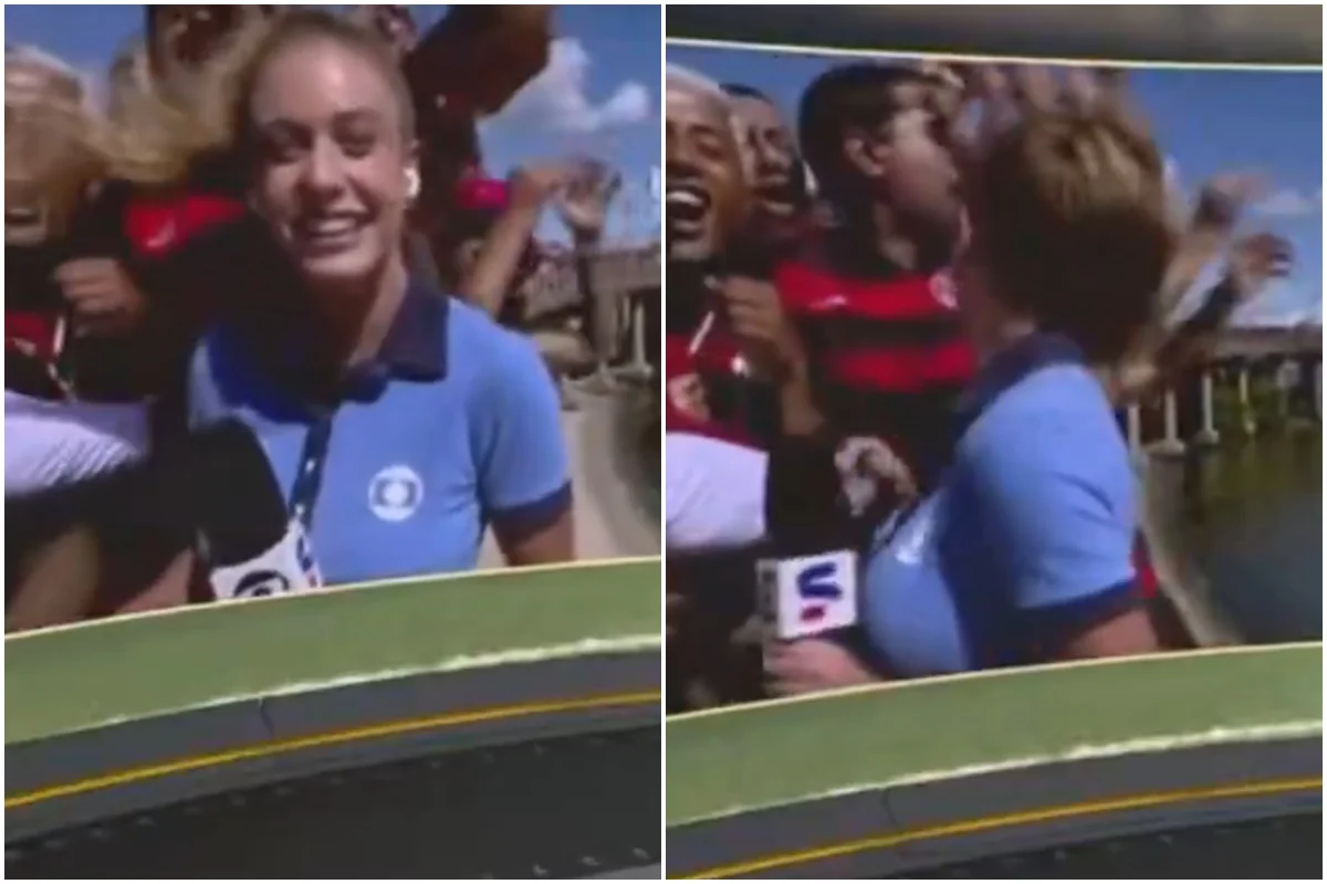 A repórter Duda Dalponte, da Globo, reagiu após levar três puxões de cabelo em meio à torcida do Flamengo na cidade de Lima, no Peru.