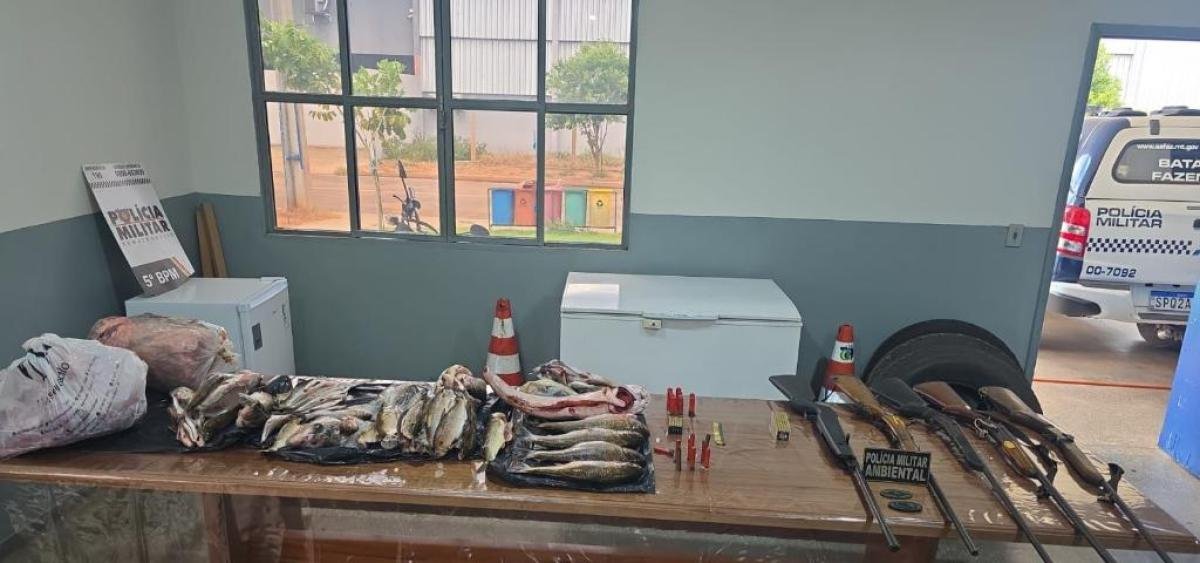 Um homem de 62 anos foi preso por porte ilegal de arma, caça ilegal de animais silvestres e armazenamento de pescado irregular, nesse sábado (29), na zona rural de Tesouro. Na ação, a PM apreendeu 5 espingardas, munições, 23 quilos de carne de caça e 17 quilos de pescado.
