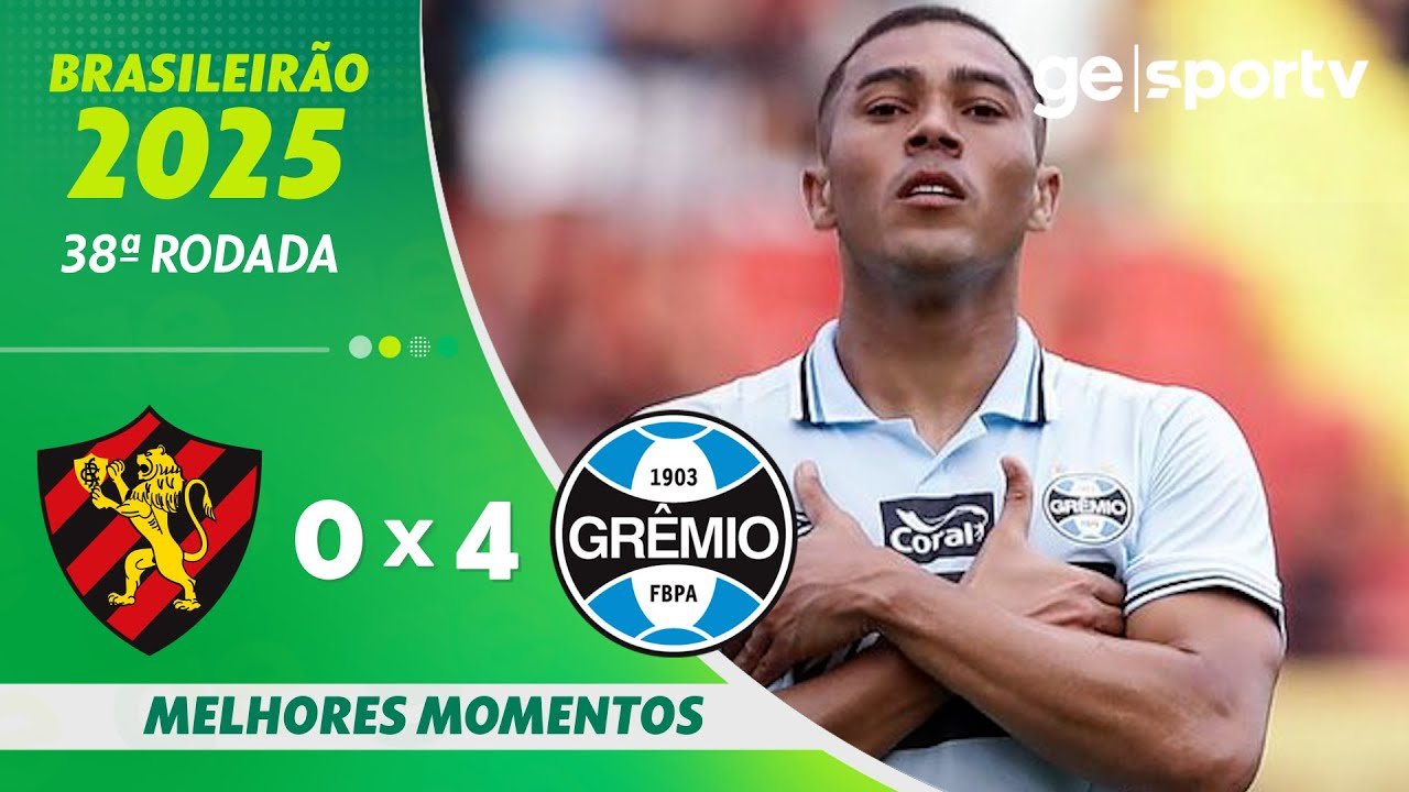 Grêmio goleia o já rebaixado Sport e garante vaga na Copa Sul-Americana em 2026. Tricolor gaúcho fez, neste domingo, 4 a 0 com facilidade na Ilha do Retiro, com gols de Carlos Vinícius (2), Gustavo Martins e Cristaldo.