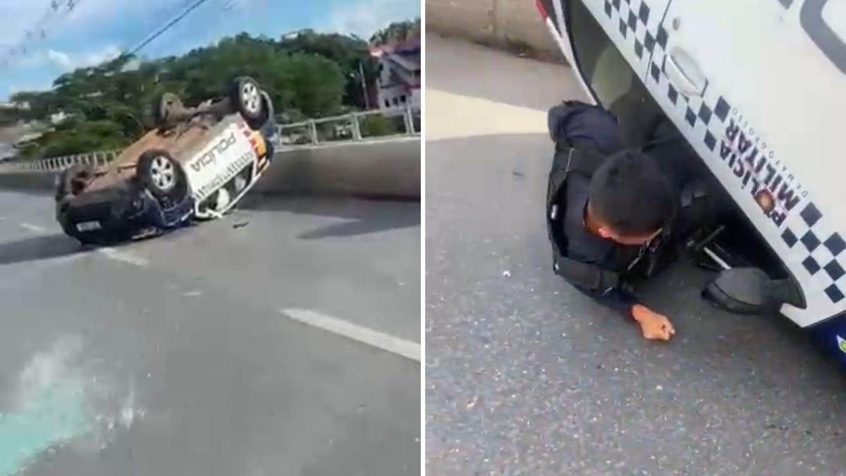 Imagens enviadas ao GD mostram a viatura oficial capotada sobre a pista, com estilhaços do para-brisa espalhados ao redor do veículo, evidenciando a força do impacto. No vídeo, é possível ver que os policiais permaneceram dentro da viatura logo após o acidente, mas, após alguns segundos, conseguem sair por conta própria e informam que estão bem.