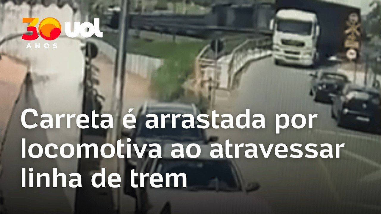 Carreta foi arrastada por uma locomotiva ao atravessar linha de trem no município de Carandaí, Minas Gerais, na segunda-feira (30) A carreta atravessou a ferrovia no momento em que o trem passava e foi arrastada, atingindo dois carros O motorista de um dos carros arrastados no acidente ficou ferido