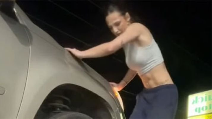 Mulher viraliza ao tentar trocar pneu furado sozinha Um vídeo mostra o perrengue de uma americana ao tentar trocar um pneu furado durante a noite. Equipada com as ferramentas necessárias, ela se esforça para soltar os parafusos da roda e, em seguida, para posicionar corretamente o macaco para levantar o veículo.
