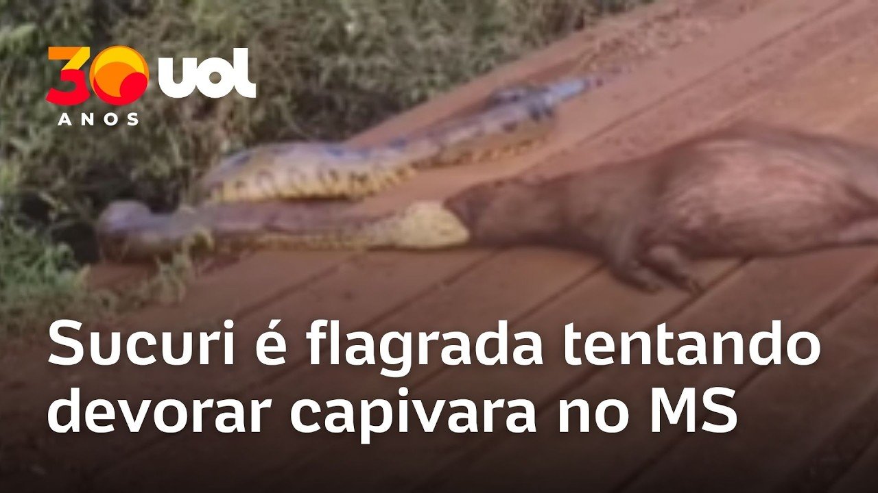 Uma sucuri foi flagrada tentando se alimentar de uma capivara, as margens de um córrego na Fazenda Refúgio, a cerca de 20 quilômetros de Sidrolândia (MS), no sentido Nioaque. O vídeo foi gravado por César Bertoldo na tarde de quinta-feira (23).
