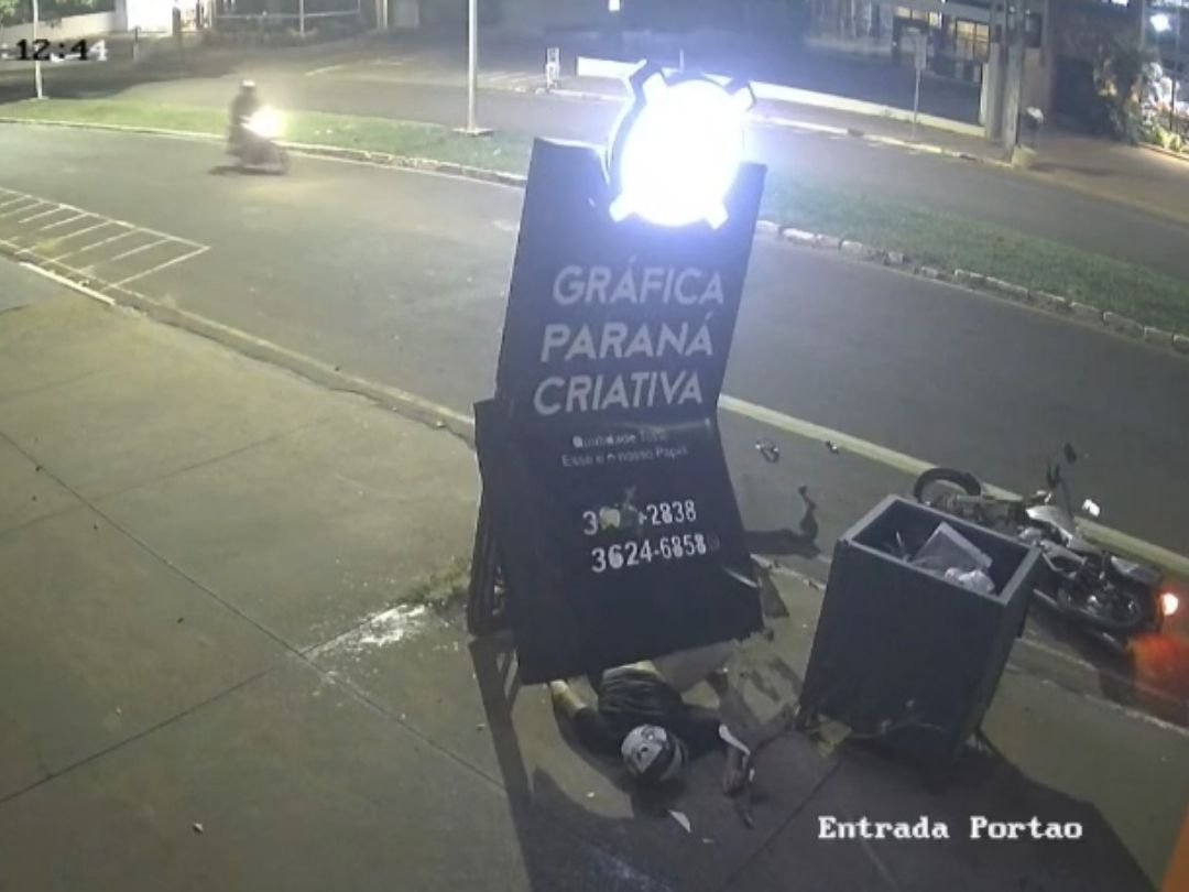 Vídeo mostra violenta colisão de motociclista contra placa de gráfica em avenida no Paraná.